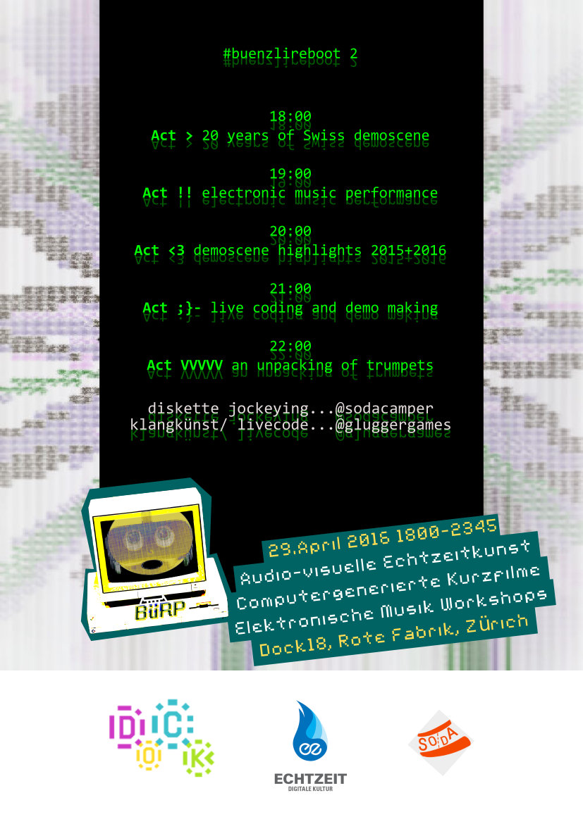 A program of demoscene productions (what..?) from Bünzli/Demodays 1991-2014 (see a brief history) and recent works by Swiss and international sceners. Big cinema projection screen, powerful sound system, side rooms with interactive works and workshops. Don't miss the Swiss scene filler event of the year!